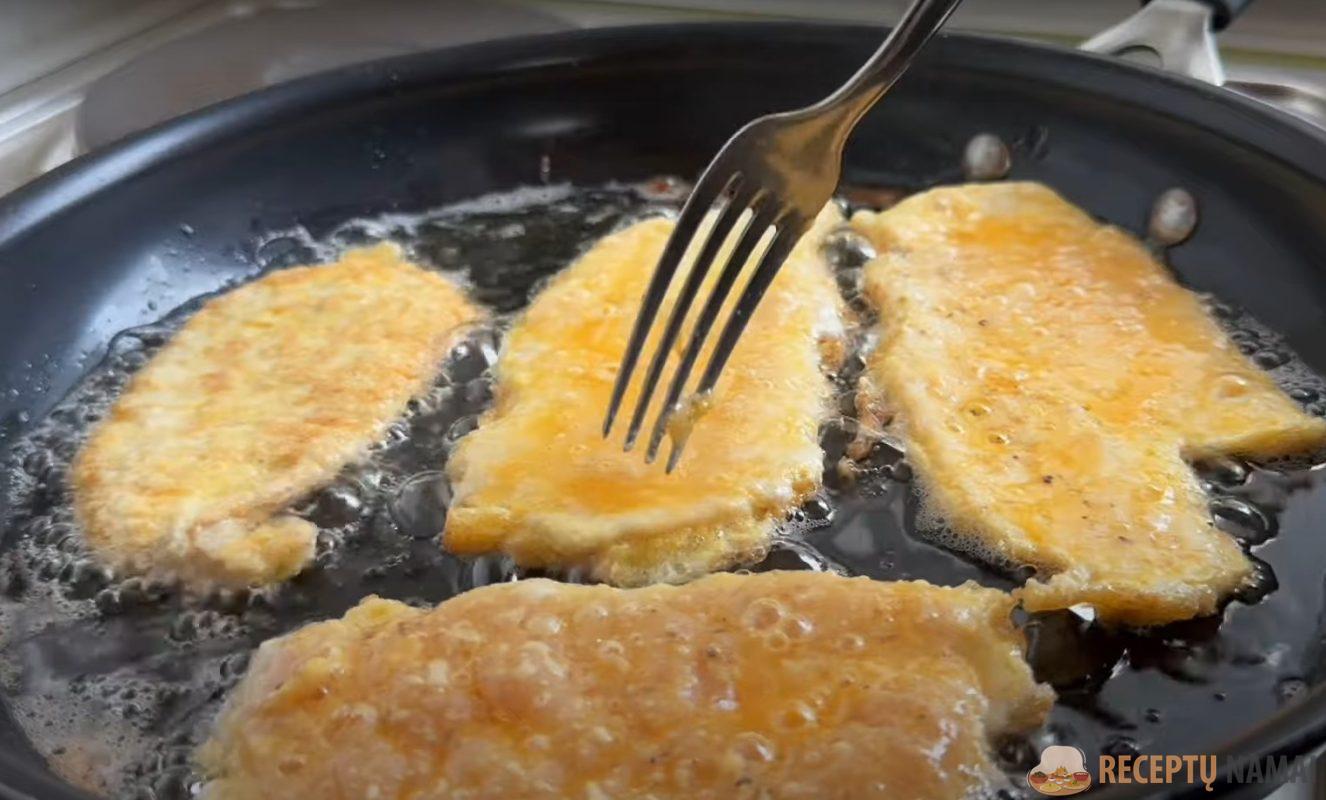 . Kiaušinius suplakite su druska, sumaišykite druską ir miltus. Įmerkite kepsnius iš pradžių į miltus, paskui į kiaušinį