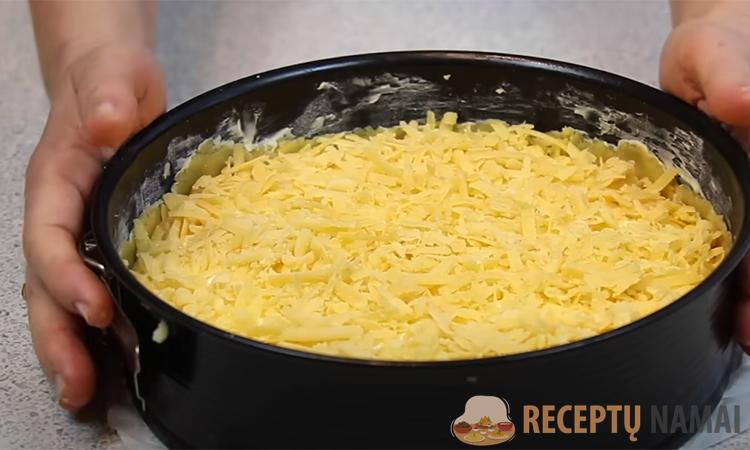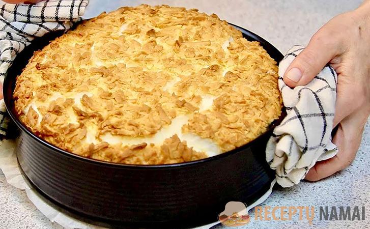 Šią masę atsargiai išplakti su grietine ir pabaigoje įmaišyti krakmolo. Grietinės įdarą sudėkite į formą su tešla. Iš šaldiklio išimtą tešlą sutarkuokite stambia tarka ir uždėkite ant pyrago viršaus. Kepkite 180 laipsnių temperatūroje 40 minučių.