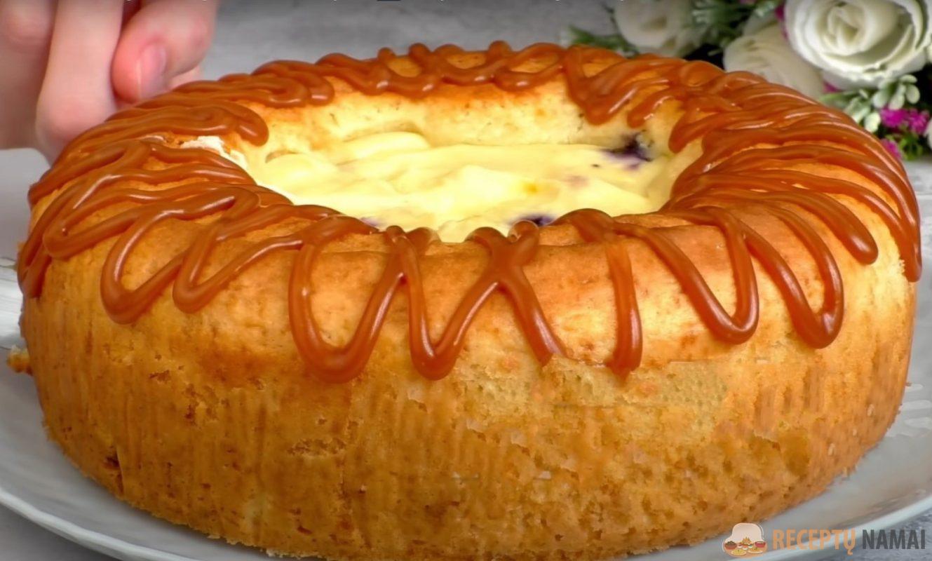 . Kremu ištepkite pyrago paviršių viduryje, kad jis įsigertų į tešlą. Pyragą kepkite 180 laipsnių temperatūroje 40-45 minutes.