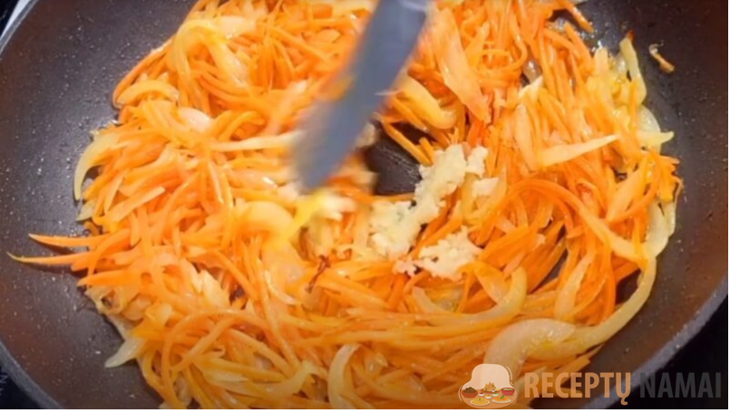 Svogūnus ir morkas pakepinkite augaliniame aliejuje, kol suminkštės. Nuolat maišykite, kad nesudegtų.