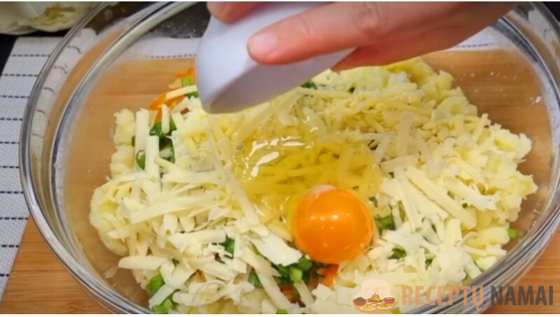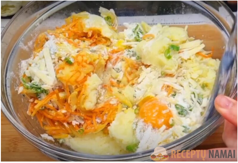 Tarkuotą sūrį sumaišykite su smulkintomis žolelėmis. Sudėkite šį mišinį į trintas daržoves ir virtas bulves. Gerai išmaišykite, kad mišinys būtų vientisas.