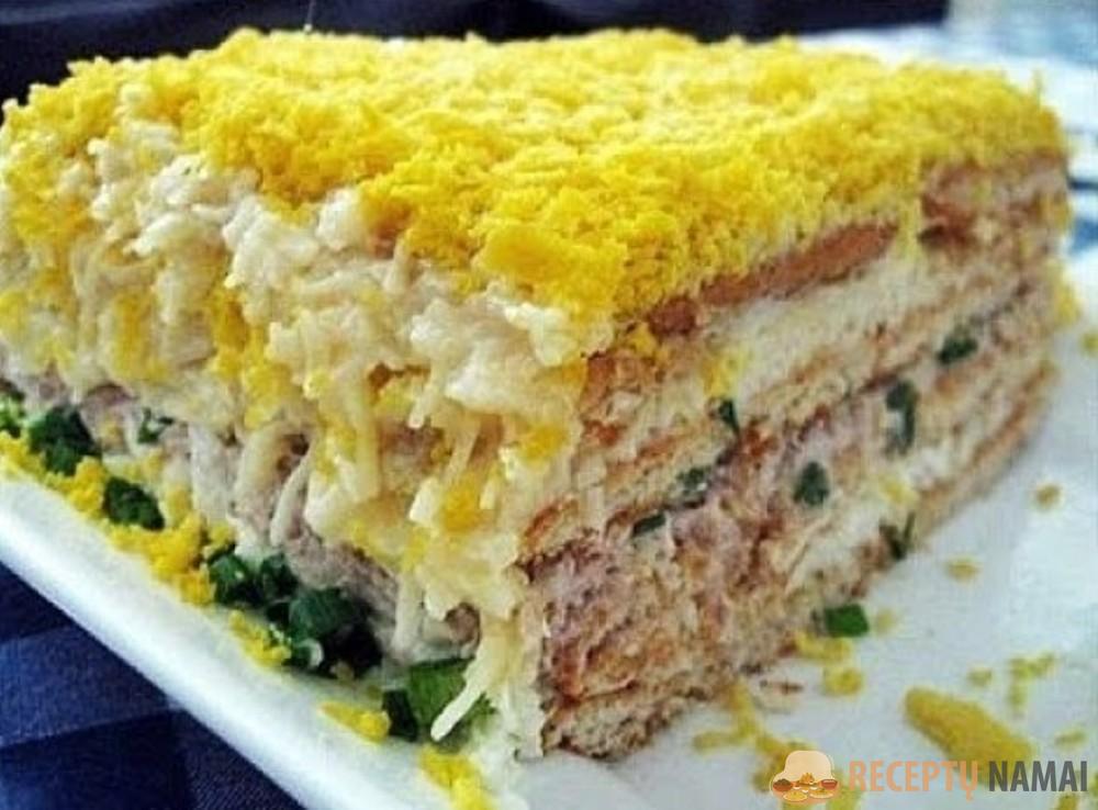 Labai minkštas, švelnus, apetitą žadinantis ir tiesiog skanus užkandinis pyragas. Sluoksnius galite kaitalioti pagal savo skonį, taip pat pridėti savo produktų. Kietąjį sūrį galima pakeisti lydytu sūriu, o žuvies konservus – susmulkintomis krabų lazdelėmis.