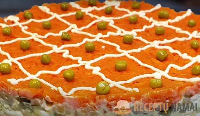 . Torto viršų papuoškite majonezo tinkleliu, apibarstykite tarkuotu tryniu ir smulkintais žalumynais.