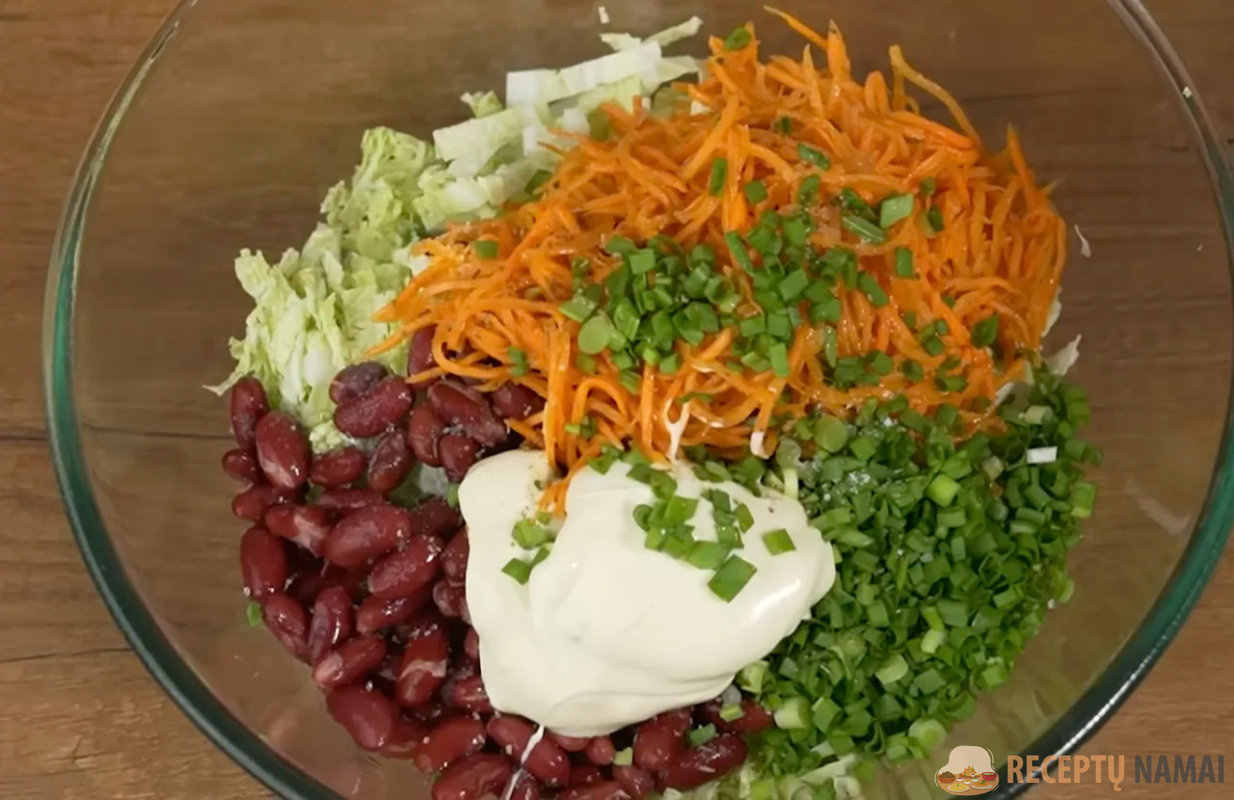 „Žieminės“ salotos su kiniškais kopūstais, pupelėmis ir korėjietiškomis morkomis. Paruošiamos per kelias minutes, o valgomos dar greičiau.