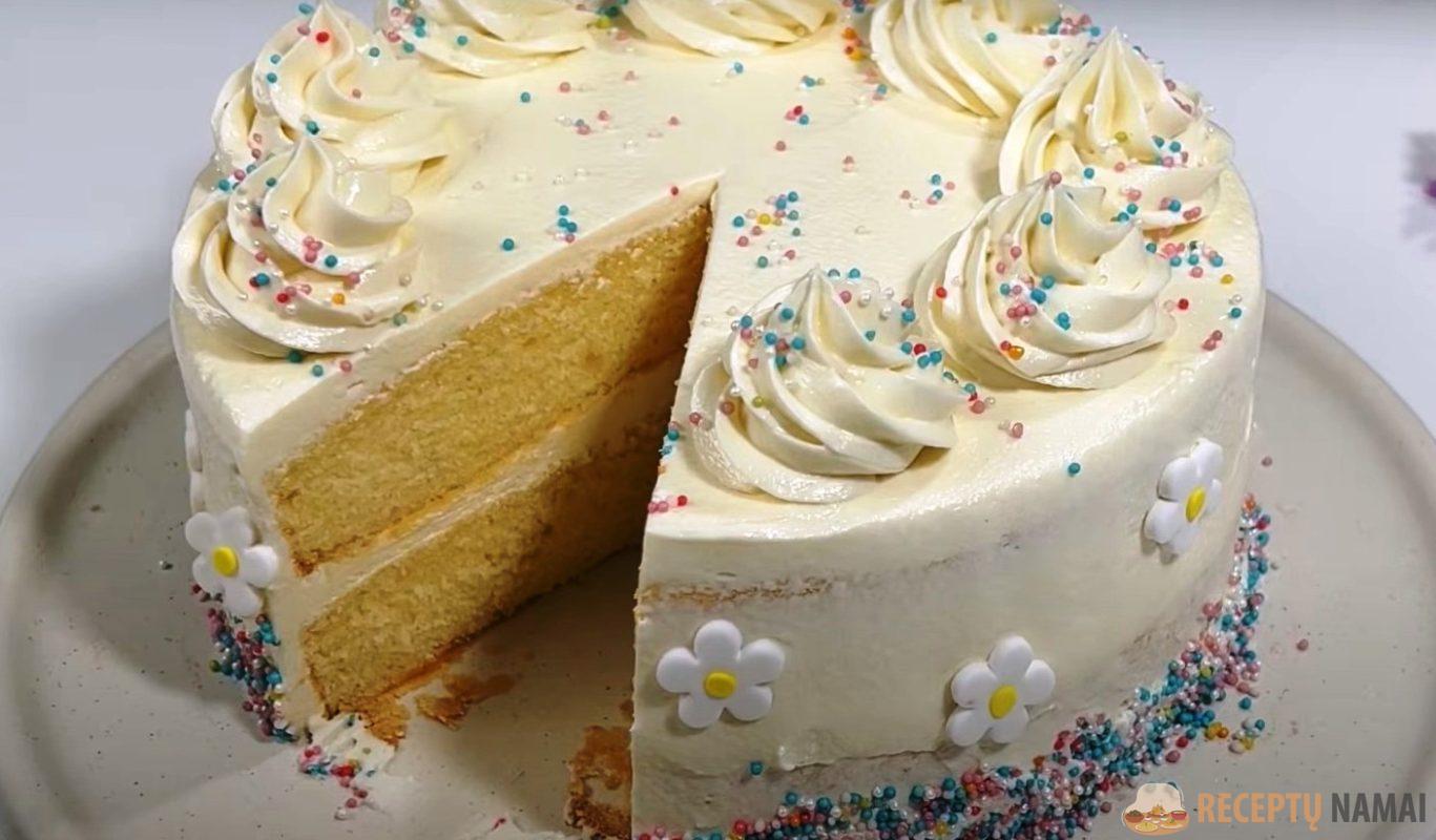 Torto viršų taip pat galite papuošti kremu, konditeriniu maišeliu ir specialiais antgaliais. Rezultatas – nuostabiai švelnus vanilinis tortas.