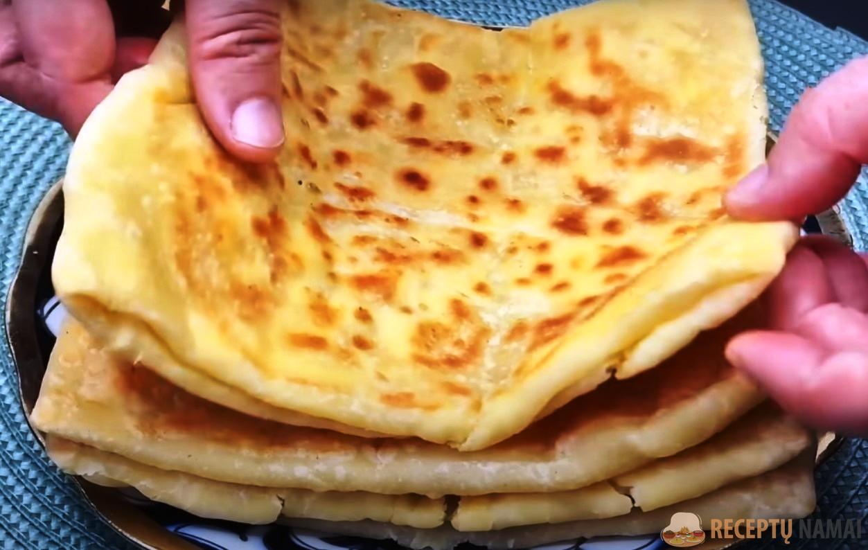 Tešlą padalykite į 4 vienodus gumulėlius ir palikite juos 10 minučių po celofanu. Tada kiekvieną gabalėlį iškočiokite į plonus plokščius pyragėlius