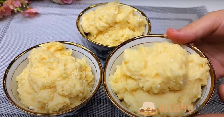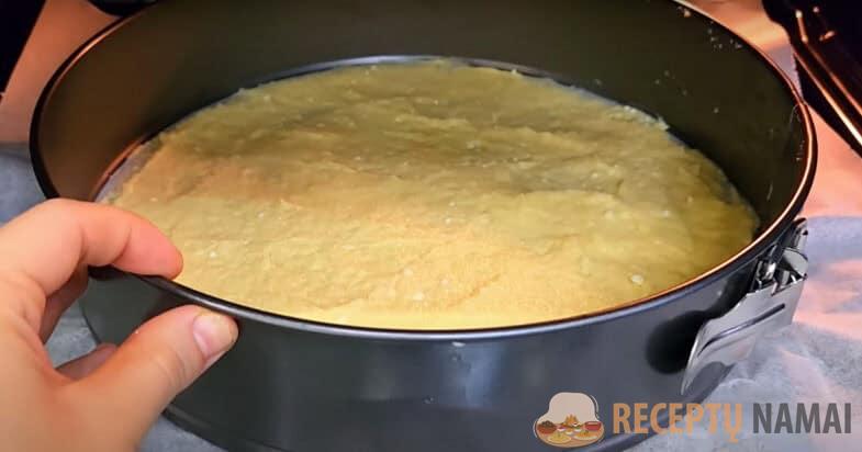 Kiaušinius, druską, cukrų dubenyje sumaišau su mikseriu, kol pašviesėja. Sudedu varškę, ištirpintą sviestą ir šaukštu išmaišau iki vientisos masės. Supilu miltus ir sodą ir išmaišau.