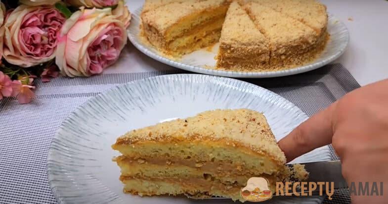Sudedu tortą, visus pyragaičius aptepu kremu, kremu aptepu viršų ir šonus. Pabarstykite trupiniais.