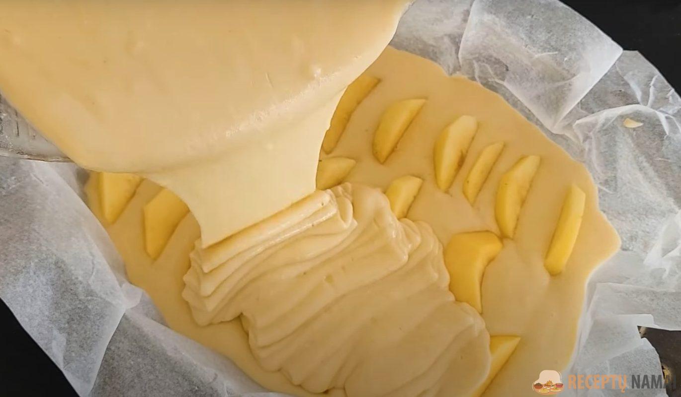 Ant obuolių supilkite likusią tešlą ir kepkite pyragą 180 laipsnių temperatūroje 40 minučių.