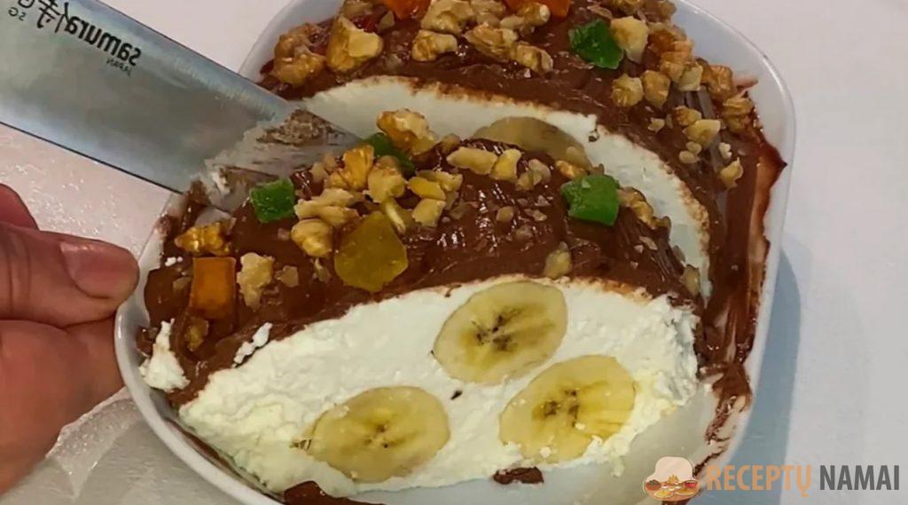 Desertas paruoštas per kelias minutes ir jo nereikia ilgai mirkyti. Švelnus skanėstas iš varškės ir bananų šokolado apvalkale. Tereikės 1 valandą palaikyti šaldytuve, kad desertas atšaltų ir taptų tirštesnis.
