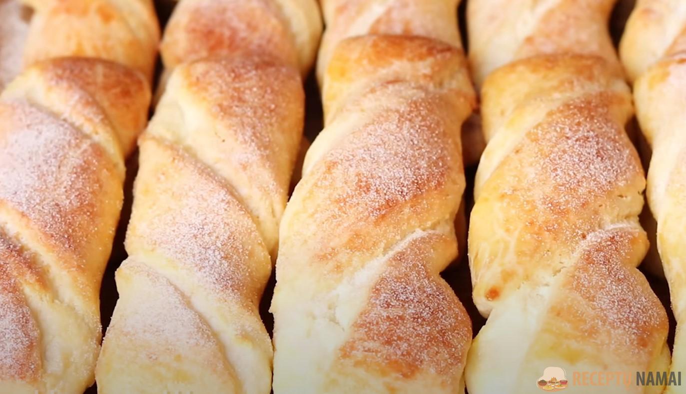 . Juosteles susukite į ritinėlius ir sudėkite ant pergamentu išklotos kepimo skardos.