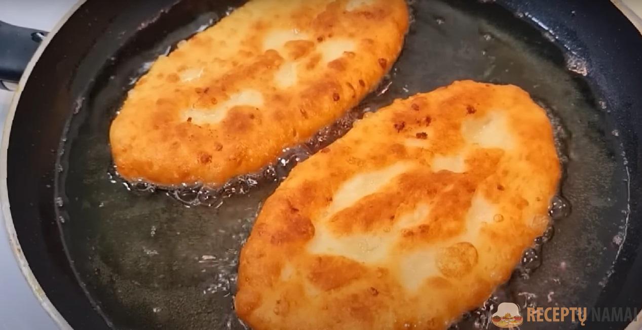Užspauskite kraštus ir visus gabalėlius suminkykite į didelius, storus pyragėlius. Keptuvėje įkaitinkite 100 ml augalinio aliejaus. Ant vidutinės ugnies apkepkite plokštainį iš visų pusių, kol paruduos.