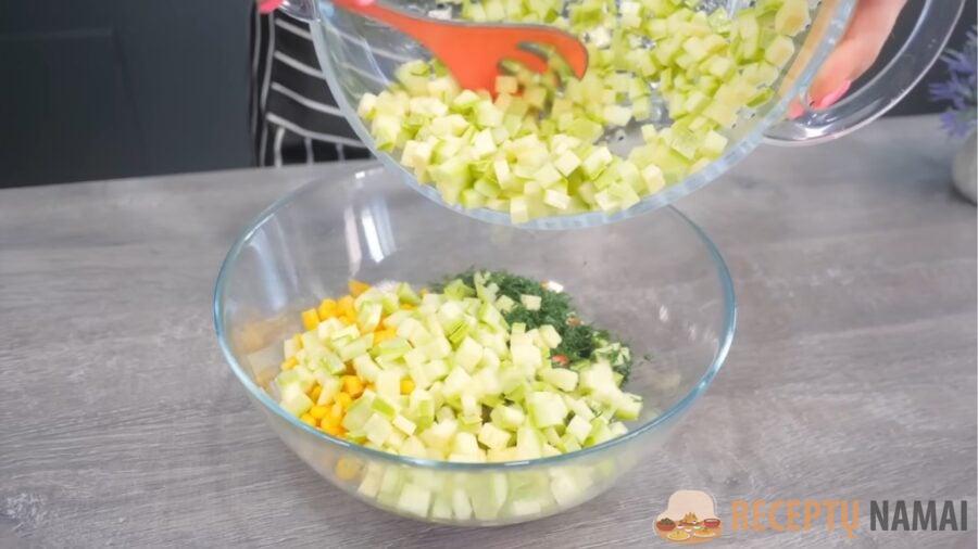 Po marinavimo nupilkite marinatą nuo cukinijų ir lengvai nuspauskite, kad pašalintumėte skysčio perteklių. Dideliame dubenyje sumaišykite marinuotas cukinijas, smulkintus krabų lazdeles, kukurūzus ir krapus. Į mišinį įpilkite majonezo ir gerai išmaišykite, kad visi ingredientai būtų tolygiai padengti padažu.