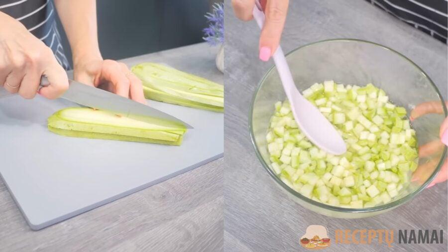Cukinijas kruopščiai nuplaukite ir nusausinkite. Supjaustykite jas plonomis juostelėmis arba mažais kubeliais – kaip pageidaujate. Tada paruoškite marinatą. Tam dubenyje sumaišykite druską, cukrų ir obuolių actą. Užpilkite verdančiu vandeniu ir gerai išmaišykite, kol druska ir cukrus visiškai ištirps. Supjaustytas cukinijas sudėkite į marinatą ir palikite 20–30 minučių. Taip cukinijos suminkštės ir įgaus ypatingą skonį.