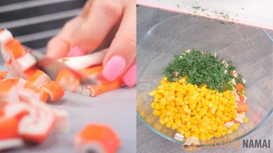 Išimkite krabų lazdeles iš pakuotės ir supjaustykite jas mažais gabalėliais. Nusausinkite skystį iš konservuotų kukurūzų. Gerai nuplaukite šviežius krapus, nusausinkite ir smulkiai supjaustykite.