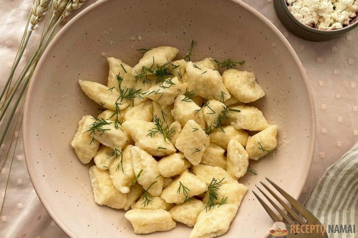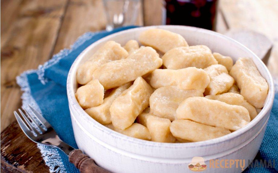 Tešlą padalinkite į kelias dalis, kiekvieną iškočiokite į ilgą voleliu primenančią juostelę, maždaug piršto storio. Aštriu peiliu supjaustykite nedideliais gabalėliais – čia galite įtraukti vaikus, nes tai smagus ir nesudėtingas procesas. Jei norite, kiekvieną virtinuką lengvai paspauskite šakutės dantukais – taip jie ne tik gražiai atrodys, bet ir geriau sulaikys padažą.