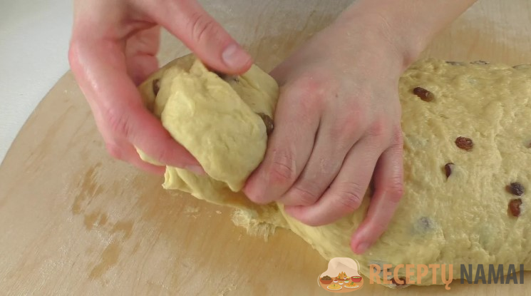 Kai sudedu visus ingredientus ir jau sunku maišyti šaukštu, tešlą perkeliu ant stalo, lengvai pabarstytą miltais. Ir toliau minkau bei iškočioju ant stalo. Minkymo metu razinos visiškai susijungia su tešla, o pati tešla tampa vienalytė ir minkšta.