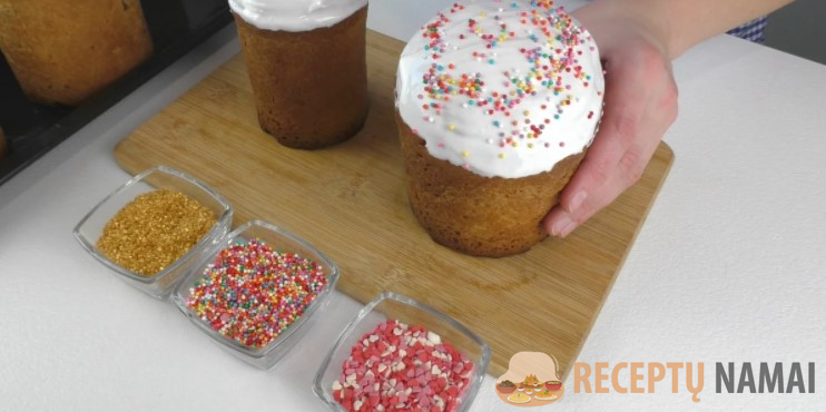 Dar šiltus Velykinius pyragus aptepkite kiaušinių baltymų glajumi ir papuoškite pagal savo skonį.