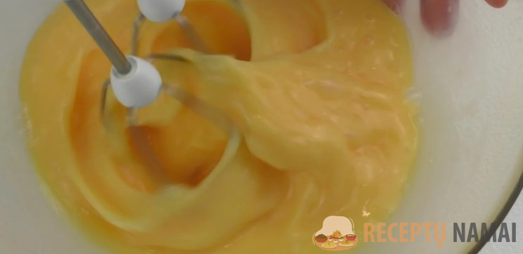 Į gilų dubenį įmušu šešis vidutinio dydžio kiaušinius. Vieno kiaušinio baltymą atidėjau į šalį (jo reikės glajui). Ir dabar kiaušinius plakiu mikseriu 2–3 minutes.