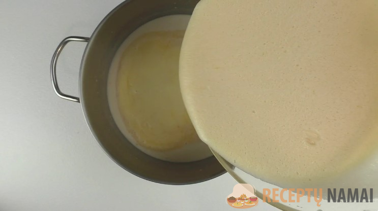 Ir supilu į kiaušinių mišinį. Išplaku šluotele ir atidedu dubenį į šalį.