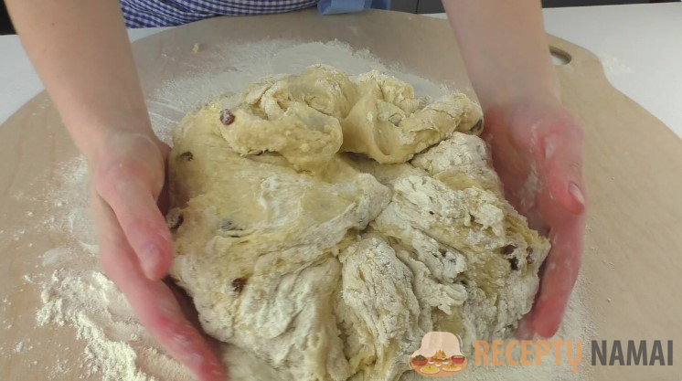 Kai sudedu visus ingredientus ir jau sunku maišyti šaukštu, tešlą perkeliu ant stalo, lengvai pabarstytą miltais. Ir toliau minkau bei iškočioju ant stalo. Minkymo metu razinos visiškai susijungia su tešla, o pati tešla tampa vienalytė ir minkšta.