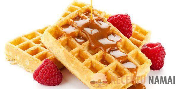 3. Sutepkite kepimo formą augaliniu aliejumi, supilkite į ją tešlą ir kepkite vaflius iki 190 laipsnių įkaitintoje orkaitėje 15 minučių.