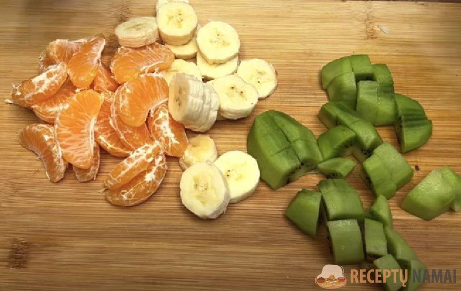 1 ŽINGSNIS: Paruoškime vaisius. Jie gali būti kokie tik norite. šiuo atveju bananas, mandarinas ir kivis.
