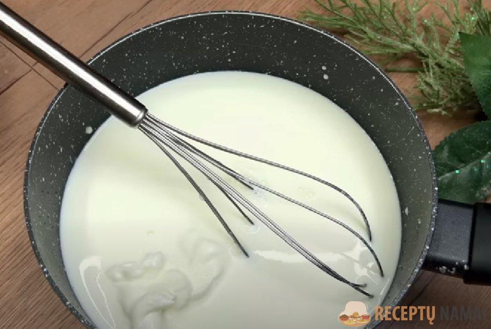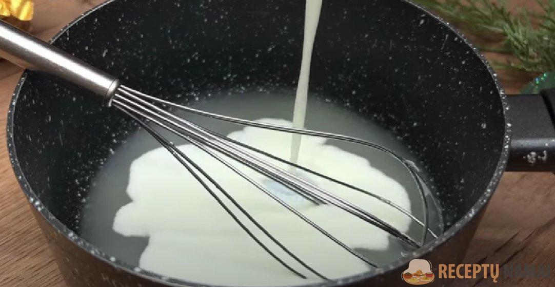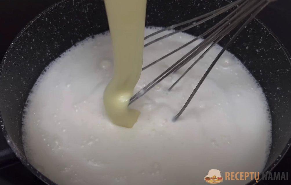 5 ŽINGSNIS: į karštą mišinį supilkite kondensuotą pieną ir išmaišykite. Nuimkite nuo ugnies.