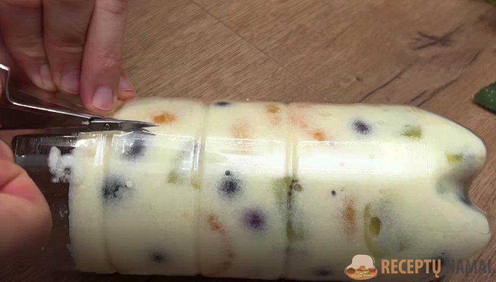 8 ŽINGSNIS: Kai masė sukietės, galite nuimti plastikinį buteliuką. Tai darome žirklėmis.