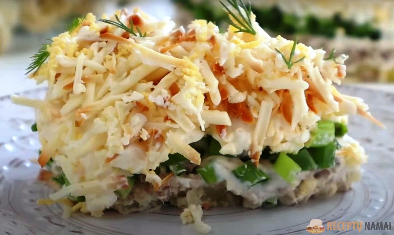 sluoksnio. Kiaušinių sluoksnį aptepkite majonezu ir ant jo užtarkuokite rūkytos dešros sūrio. Sūrio sluoksnį uždenkite plonu majonezo tinkleliu, ant viršaus užtepkite trynius.