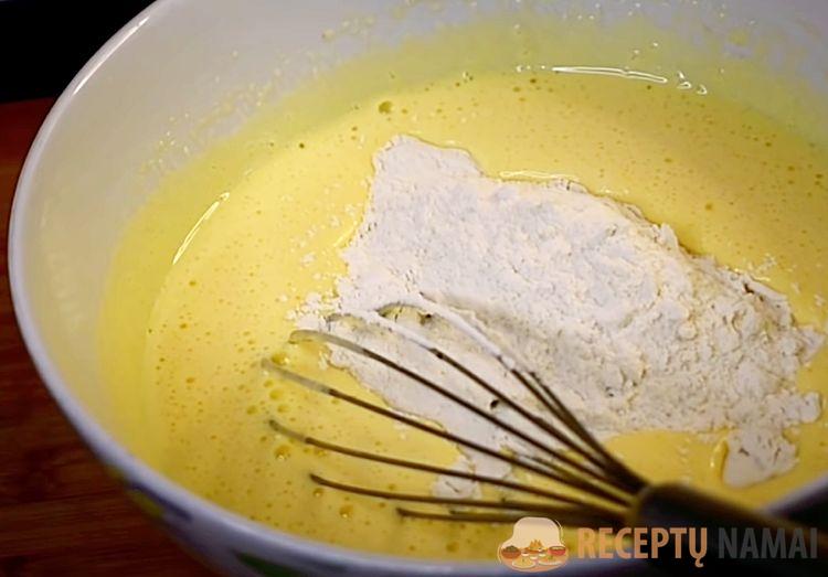 1. Dubenyje mikseriu suplakite du kiaušinius, 100 g cukraus ir žiupsnelį vanilės, tada supilkite 100 ml pieno ir išmaišykite paprastu plakikliu. Supilkite miltus ir kepimo miltelius ir plaktuvu išminkykite skystą tešlą iki vientisos masės.