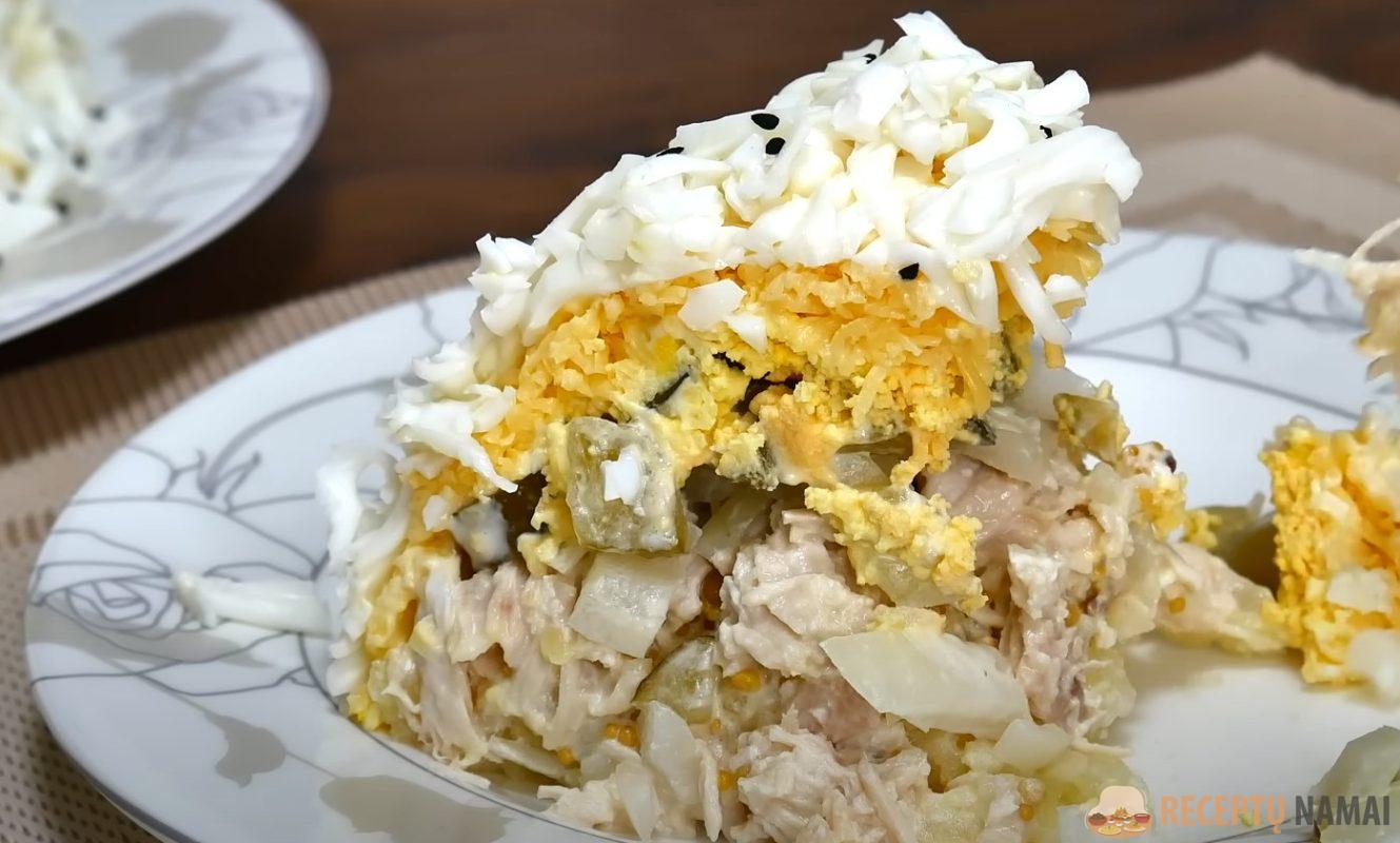 Supjaustykite nedidelius svogūnus kubeliais, sumaišykite su druska, cukrumi, actu ir karštu vandeniu, palikite marinuotis 30 min. Vištienos krūtinėlę smulkiai supjaustyti ir sumaišyti su pora šaukštų majonezo
