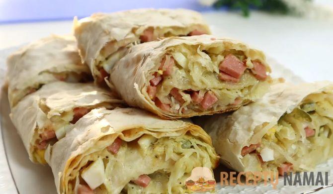 Skanus “Pita Roll” su kopūstais, marinuotais agurkais ir dešra paprastas receptas namuose. Receptas – labai skanus pitos vyniotinis, primenantis kopūstų pyragą. Įdaras – produktų derinys šaunus, labai plonai supjaustyti kopūstai, čia puikiai tinka rauginti agurkai, virti kiaušiniai ir smulkiais kubeliais supjaustyta dešra, tačiau tai nėra būtina. Galite jos nedėti, vis tiek bus labai skanu.