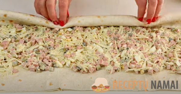 2. Uždenkite antrąjį lakštą ir išdėliokite įdarą, paskirstykite ir susukite suktinuką, o kad tilptų ant kepimo skardos, perpjaunu per pusę.