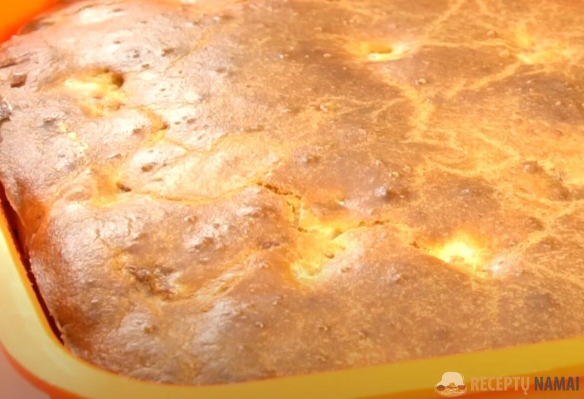 . Į mišinį persijokite miltus ir kepimo miltelius, užminkykite šiek tiek tirštą tešlą