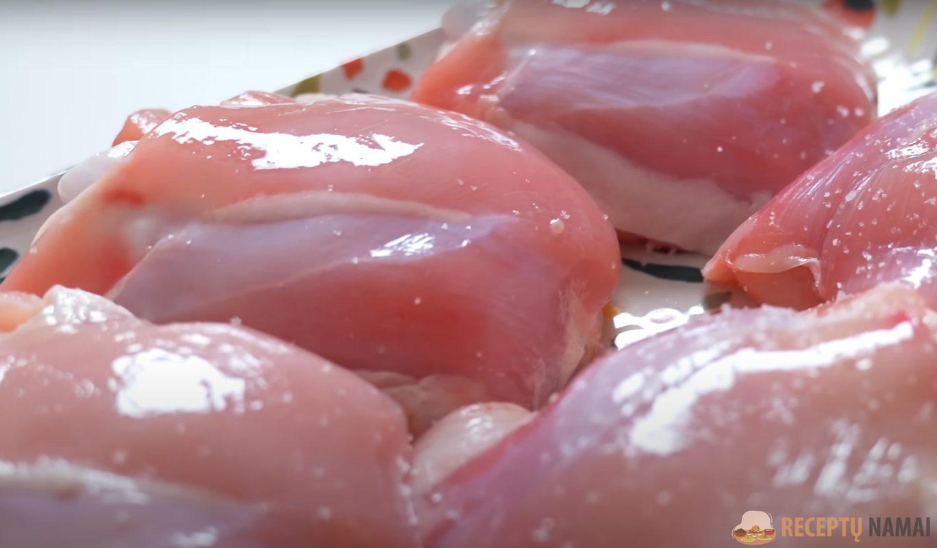 Vištienos šlauneles iš abiejų pusių pasūdykite ir papipirinkite. Keptuvėje daržovių ir sviesto aliejuje vištieną apkepkite iki auksinės spalvos.