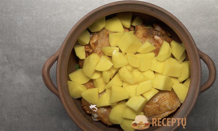 Vištiena su bulvėmis valstietiško stiliaus vazonuose