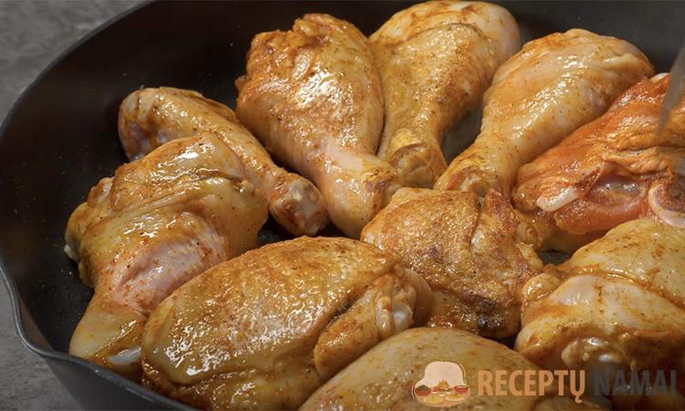 Pirmiausia greitai viską paruošime darbui. Vištienos kojas supjaustykite į 2 dalis. Svogūną, česnaką, morkas, bulves supjaustykite kubeliais. Pomidorus supjaustykite apvaliais griežinėliais. Dabar perkelkite vištieną į gilų dubenį. Pabarstykite druska, pipirais, kalendromis, paprika, apvoliokite ir palikite pasimarinuoti 30 min. Įkaitinkite keptuvę ant stiprios ugnies. Kepkite vištieną iš abiejų pusių iki auksinės rudos spalvos, maždaug 3 minutes iš kiekvienos pusės.