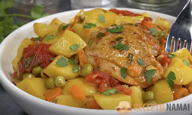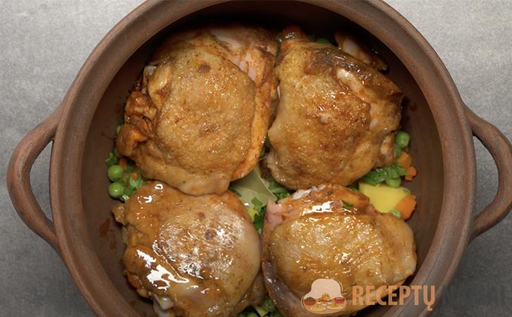 Ingredientai 6 porcijoms: 1400 gramų vištienos šlaunelių, 1 kilogramas bulvių, 250 gramų svogūnų, 130 gramų šaldytų žaliųjų žirnelių, 380 gramų šviežių pomidorų, 4 skiltelės česnako, 10 gramų šviežių petražolių, 1/3 arbatinio šaukštelio maltų juodųjų pipirų, arbatinio šaukštelio rūkytos paprikos, 1/2 šaukštelio maltos kalendros, 1 lauro lapas, šaukštas augalinio aliejaus, 500 mililitrų vandens, 2 arbatiniai šaukšteliai druskos. Virsime keraminiuose puoduose.