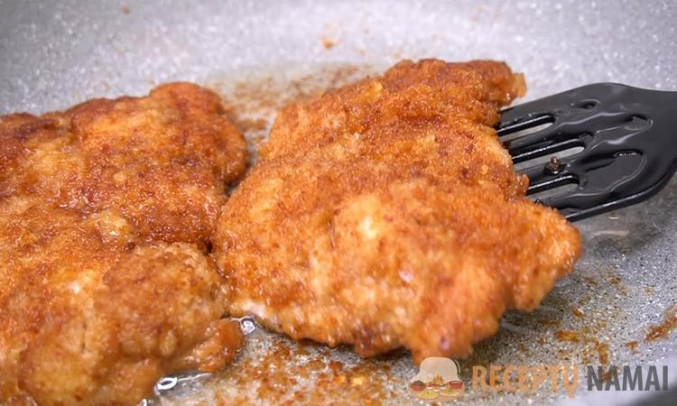 Perkelkite mėsą į gilų dubenį, įpilkite majonezo ir palikite šaldytuve po plėvele. Dabar išimkite kotletus iš šaldytuvo. Kiekvieną gabalėlį apvoliokite džiūvėsėliuose. Keptuvėje įkaitinkite augalinį aliejų ir apkepkite kotletus iš abiejų pusių.