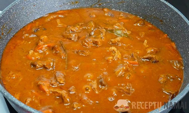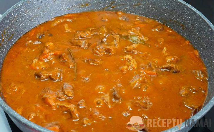 Pagardinkite druska ir pipirais, sumažinkite kaitrą iki minimumo ir troškinkite 10 minučių uždengę, kol mėsa suminkštės, o padažas taps tirštas ir sodrus. Galiausiai įpilkite grietinės arba graikiško jogurto, švelniai išmaišykite ir virkite dar porą minučių.