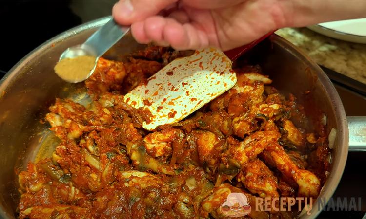 Kepkite juos 3–4 minutes, kol sumažės tūris ir pradės skleisti kvapnumą, sudėkite susmulkintą česnaką ir pakaitinkite dar 30 sekundžių. Sudėkite pomidorų pastą ir saldžiąją papriką, gerai išmaišykite ir pakaitinkite porą minučių, kad atsiskleistų skonis. Grąžinkite vištieną į keptuvę, suberkite miltus, gerai išmaišykite, kad neliktų gumulėlių, ir palaipsniui supilkite karštą vandenį arba sultinį.