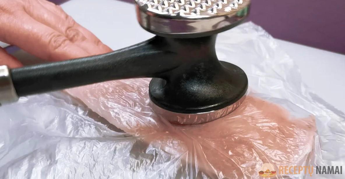 . Kiekvieną gabaliuką gerai išmuškite iš abiejų pusių – turi gautis dideli mėsos sluoksniai.