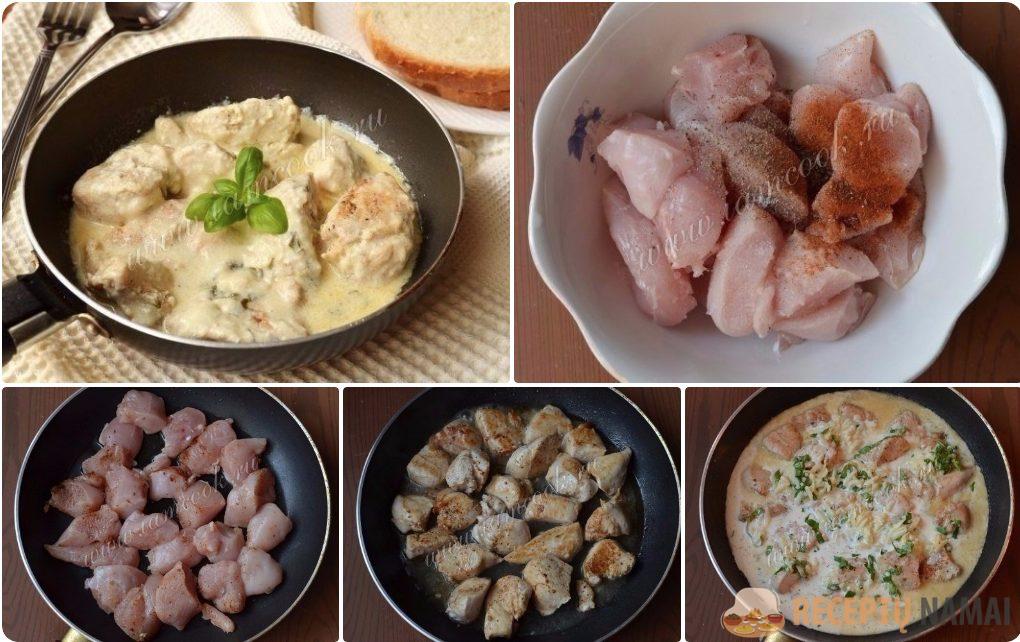 Supilkite grietinėlės padažą į keptuvę su vištiena ir gerai išmaišykite.
