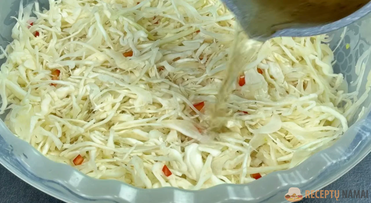 Atskirai sumaišau padažo ingredientus: cukrų, druską, actą, augalinį aliejų, garstyčias ir juoduosius pipirus. Užpilu padažu daržoves ir gerai išmaišau.