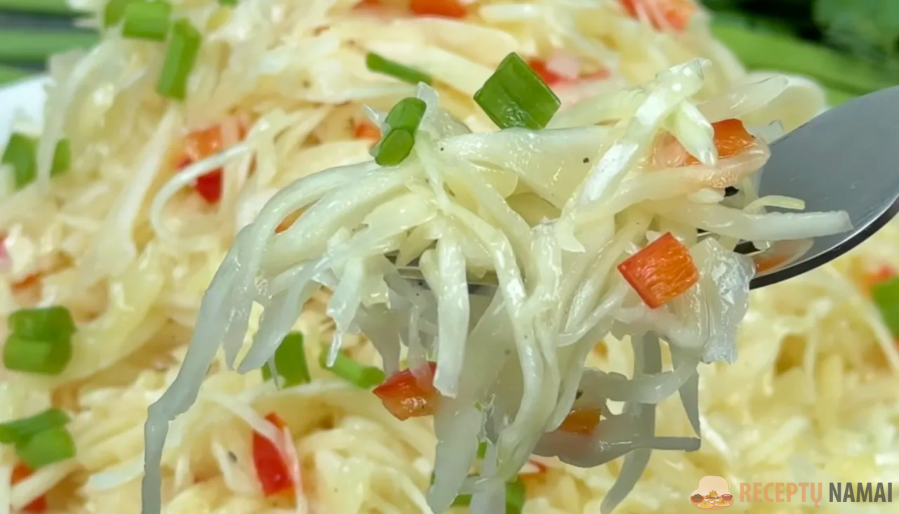 Salotas perkeliu į indą, šiek tiek sutankinu, uždengiu dangčiu ir palieku šaldytuve 10–12 valandų. Po 12 valandų kopūstai visiškai pasimarinuoja – ir salotos yra paruoštos patiekti!