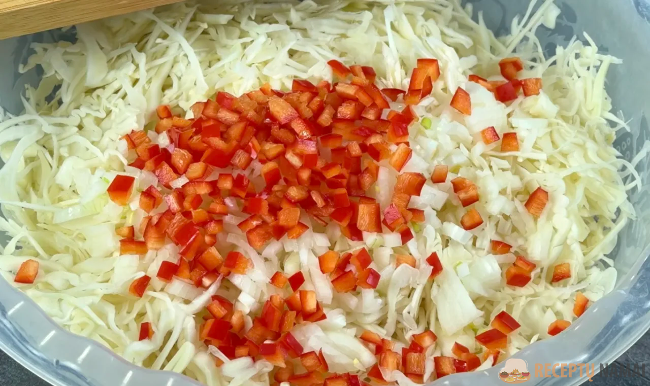 Smulkiai supjaustykite kopūstą. Svogūną supjaustykite mažais kubeliais. Papriką supjaustykite mažais kubeliais. Visas daržoves sudėkite į didelį dubenį ir šiek tiek sutrinkite rankomis.
