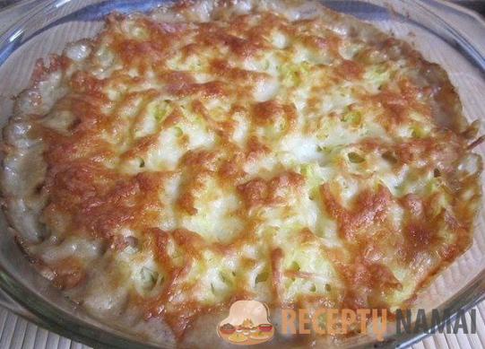 5. Vištienos filė su grybais sudėkite į kepimo formą, ant viršaus sudėkite bulves ir pabarstykite sūriu.