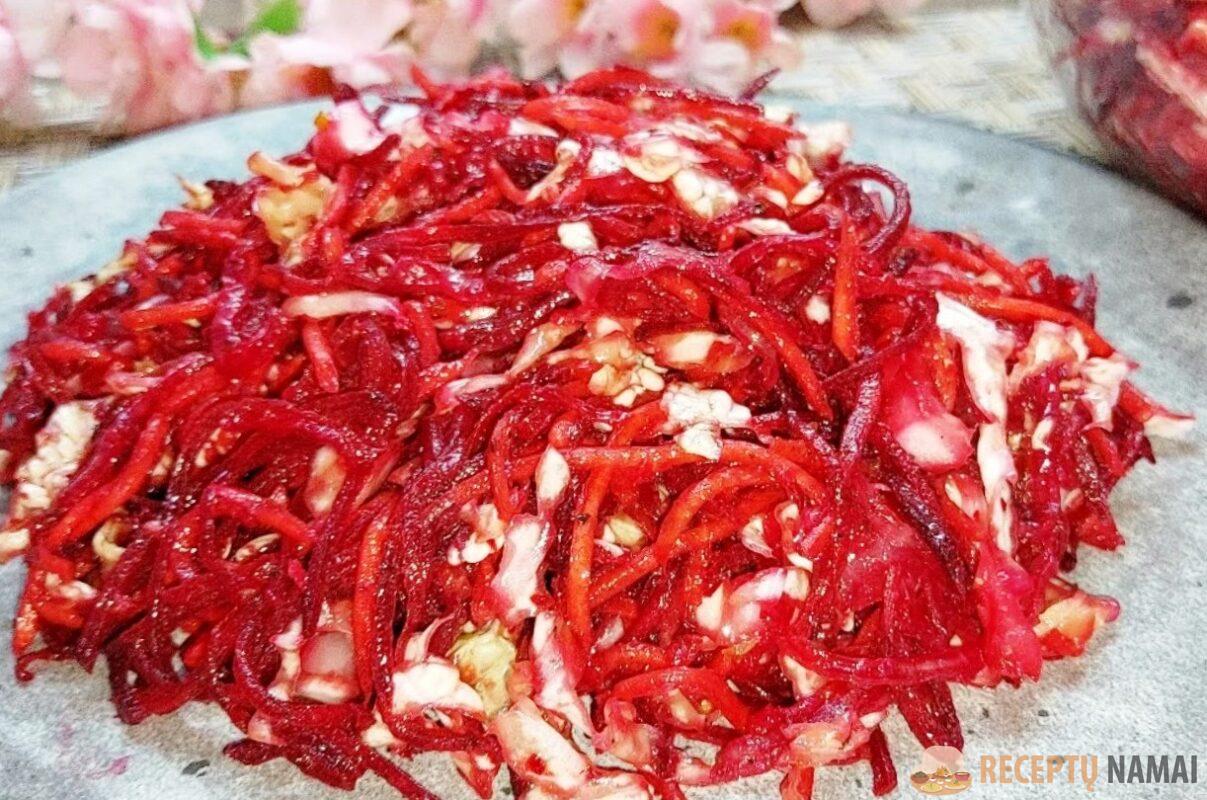 Gauname paprastas salotas iš šviežių burokėlių. Šiam receptui daržovių virti nereikia.