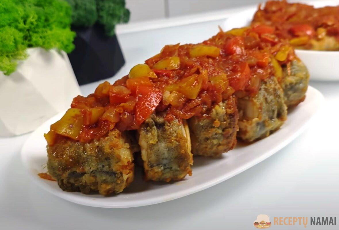 Žuvį išvalykite iš vidaus, pašalinkite pelekus ir galvą, nuplaukite ir pašalinkite odą. Supjaustykite žuvį nedidelėmis porcijomis